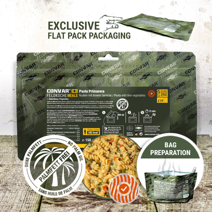 Pasta Primavera from CONVAR™ is a wholesome, creamy meal with plenty of vegetables and a mild, light sauce. Ideal for demanding situations in the tactical field, on outdoor tours or to supplement a well-stocked emergency supply. The balanced recipe does not contain any palm fat and impresses with its fine taste and reliable satiety.