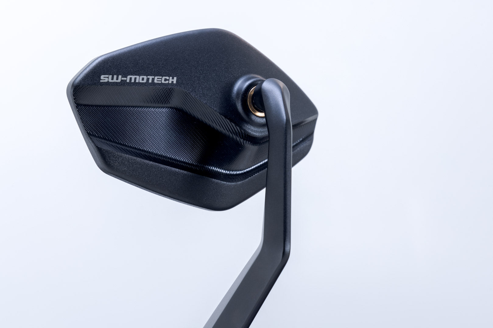 Make your Triumph motorcycle stand out with the handlebar end mirrors from SW-MOTECH. The mirrors are made from forged, milled and black anodized aluminum and feature engraved logo details. Thus, they add a robust yet elegant touch to your handlebars.