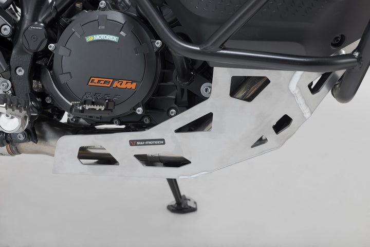 This engine guard made of 4 millimeter-thick aluminum sheet has been specially developed for the KTM 1290 Super Adventure. It protects the oil filter as well as other engine components.