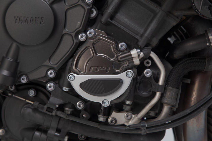 Protector set machined of high strength aluminium alloy for right and left engine case cover. The elegant construction protects exposed case parts from ground contact and in a fall, effectively protects from greater damage. The protectors are made of black anodized and silver anodized light metal.