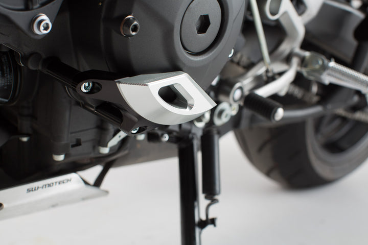 Protector for the left engine cover machined of aluminium alloy. The elegant construction protects exposed case parts from ground contact and in a fall, effectively protects from greater damage. The protector consists of black and silver anodized light metal.