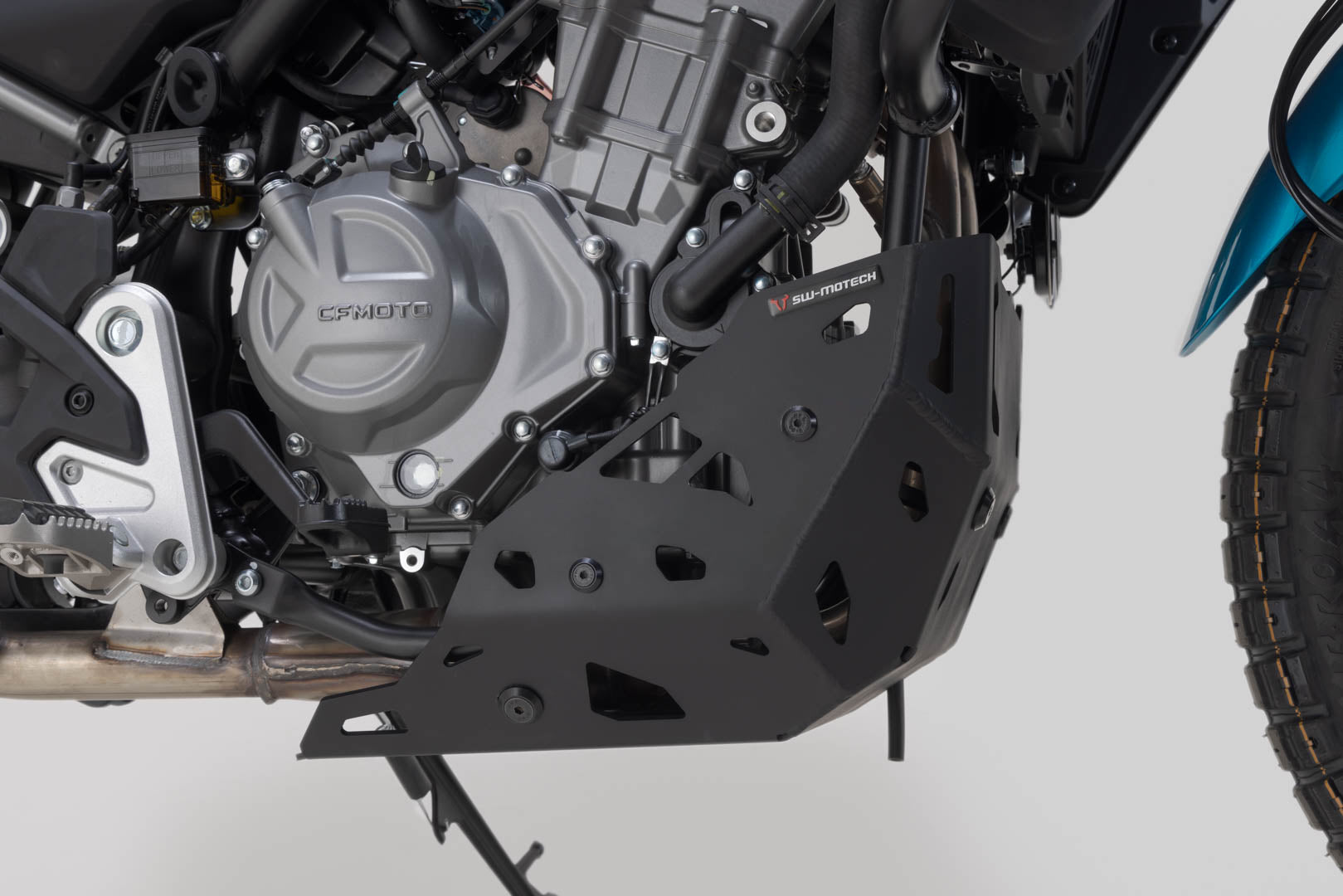 This engine guard made of 4 millimeter thick aluminum sheet was specially developed for the CFMoto 450MT.