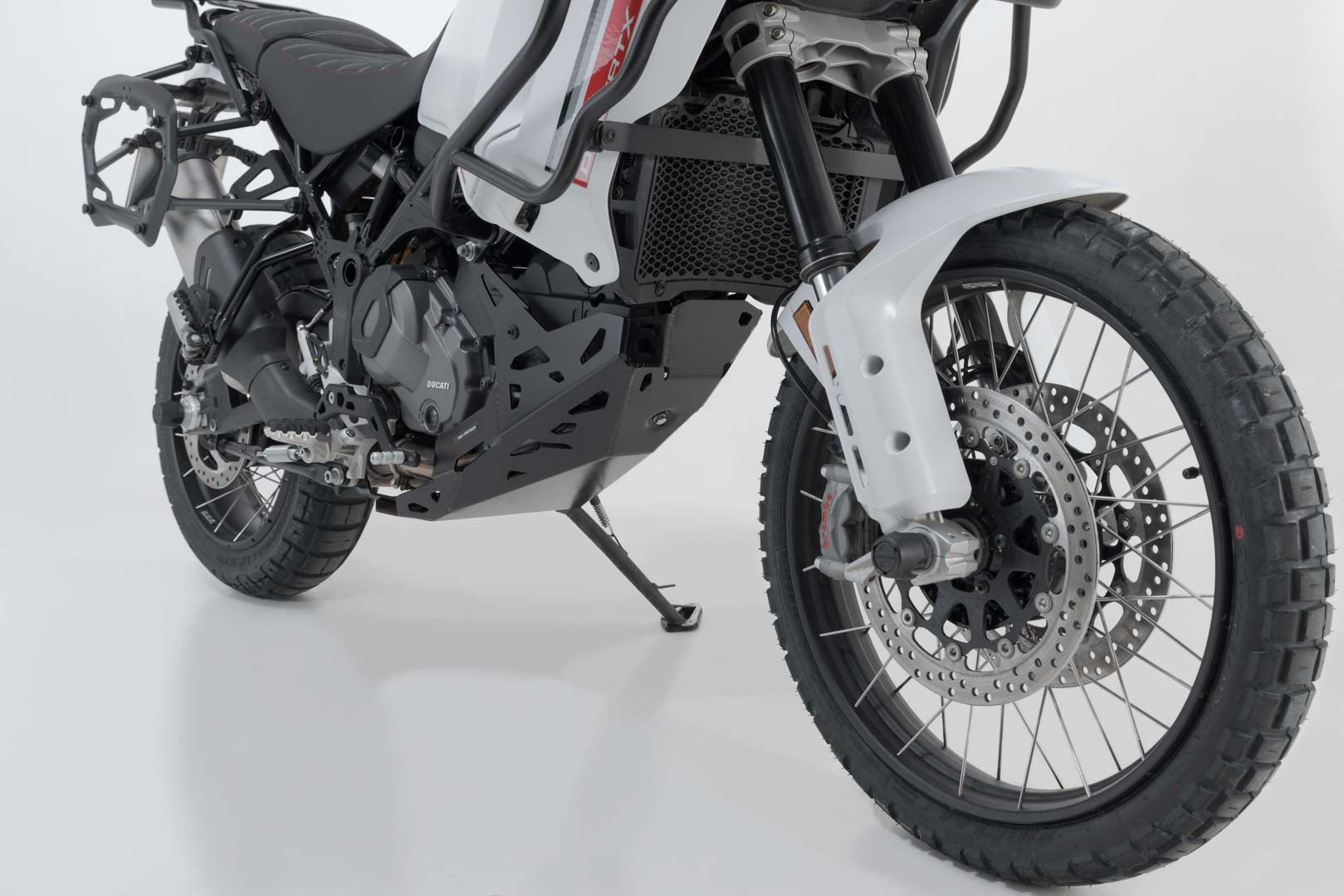This engine guard made of 4 millimeter-thick aluminum sheet was specially developed for the Ducati DesertX (22-). It protects the oil filter and other engine parts that make up the crossplane engine.