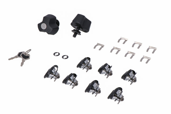 One key for nine locks - With this lock set you can easily operate all locks on your TRAX aluminum cases with just one key.The TRAX lock set with anti-theft protection includes three locks for locking the case lid, three additional locks for locking the case to the side carriers, a lock for the tool box and two anti-theft systems with locks for PRO side carriers. All nine locks are matching. Two keys are also included. The lock set is suitable for all aluminum cases from the TRAX ADV and TRAX ION series.