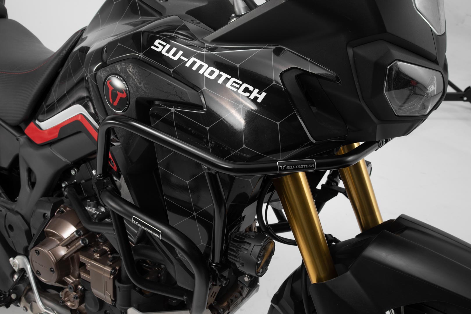 The upper crash bars are constructed of black, powder-coated steel and are mounted as a supplement to the crash bar by SW-MOTECH.