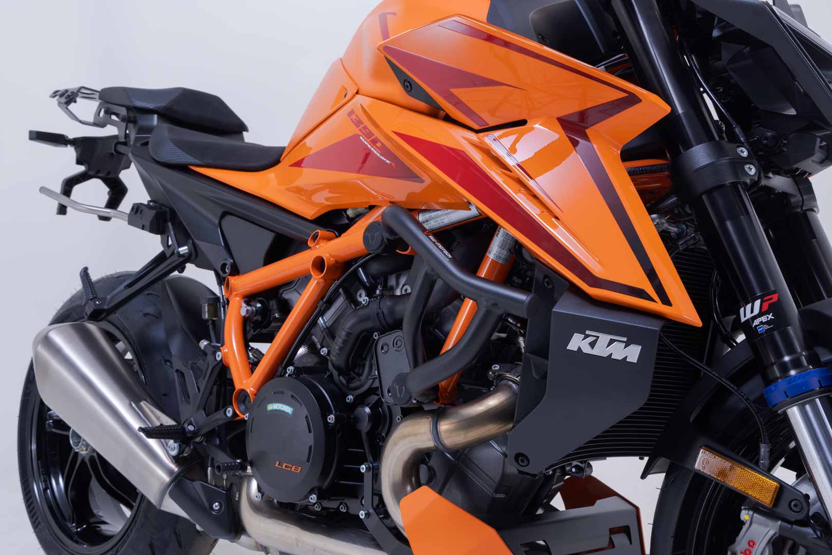 To match the KTM 1390 Super Duke R / EVO, the crash bars made of tubular steel with a diameter of 22 / 27 mm are offered with a weather- and corrosion-resistant powder coating in Electronic Orange. The surface finishing is carried out in a state-of-the-art facility in the SW-MOTECH plant in Brno in the Czech Republic.