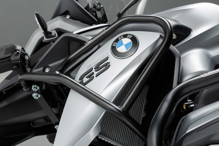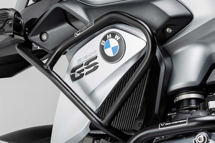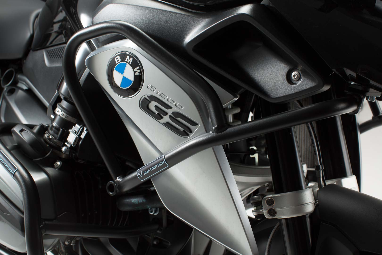 The upper crash bars are constructed of black, powder-coated steel and are mounted as a supplement to the crash bar by SW-MOTECH.