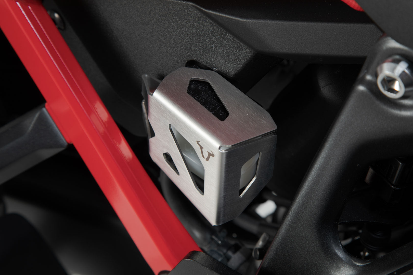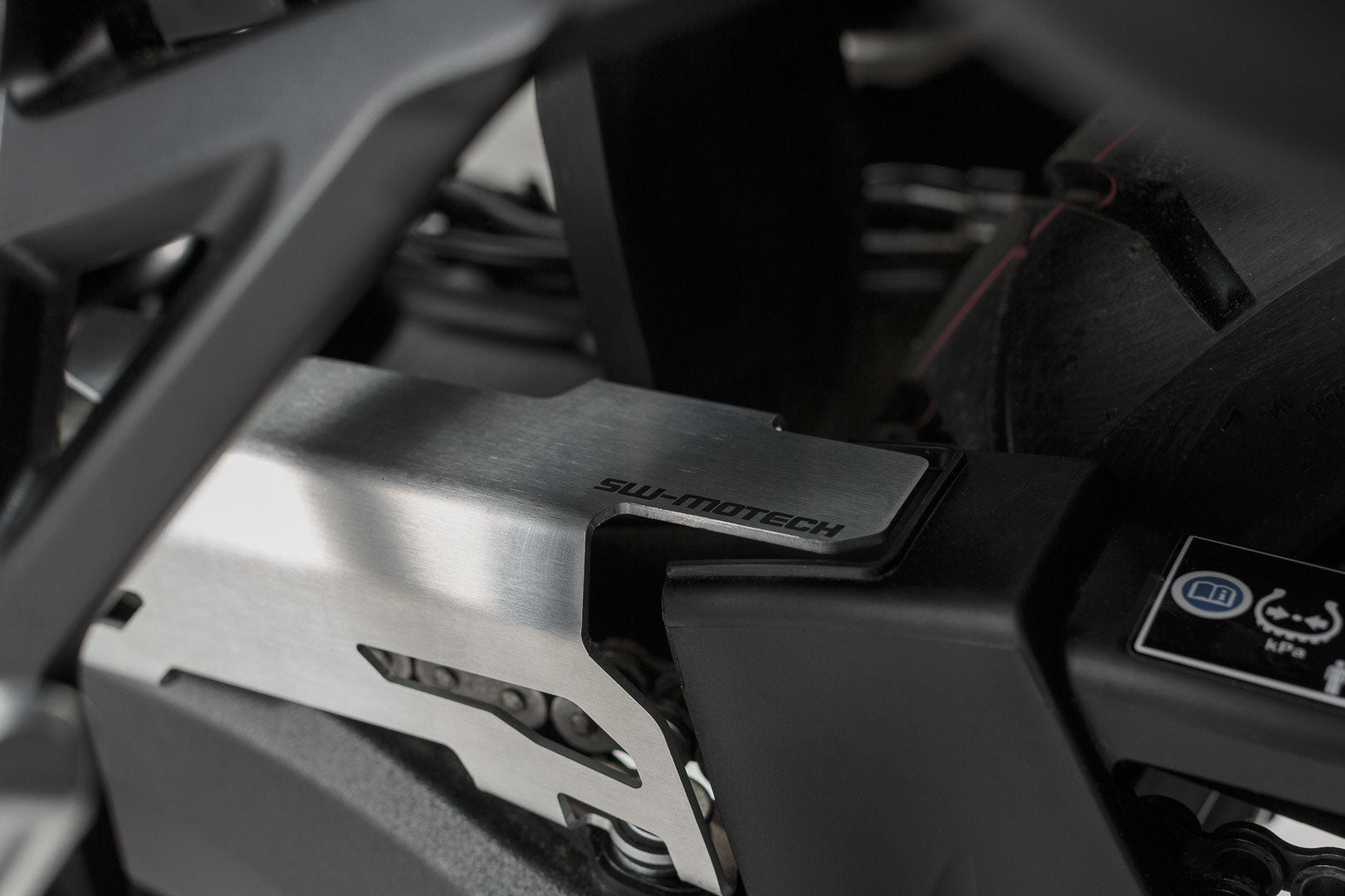 The protection set contains the following components suitable for the Honda Africa Twin CRF 1000L: Header pipe guard, Chain guard extension and Brake fluid reservoir guard.