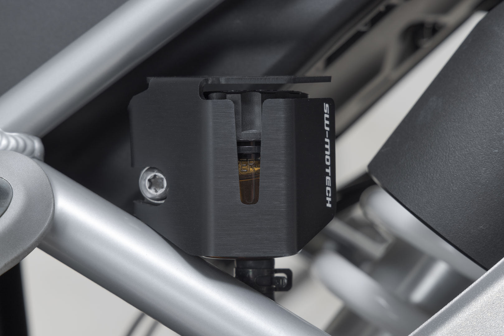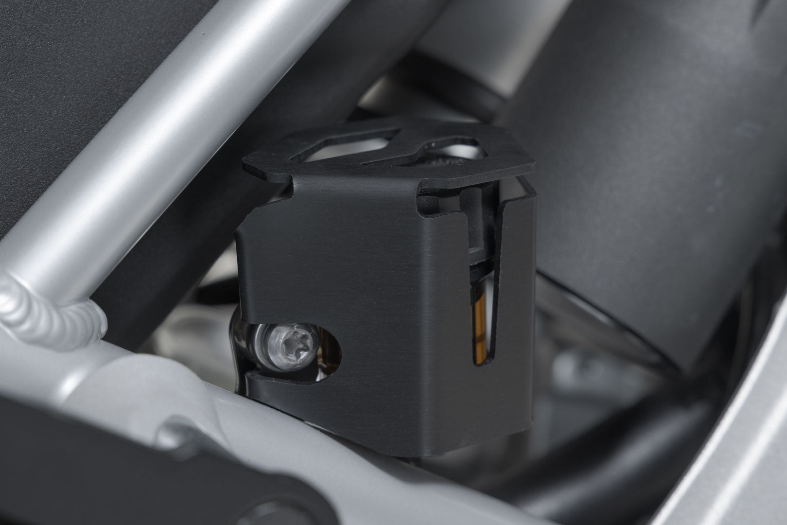 The compact brake reservoir guard protects the original brake reservoir from rock chips and simultaneously prevents unwanted removal of the cover. The protector can be installed on the motorcycle in a few simple steps.