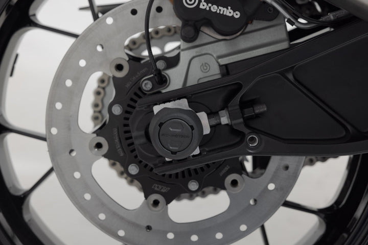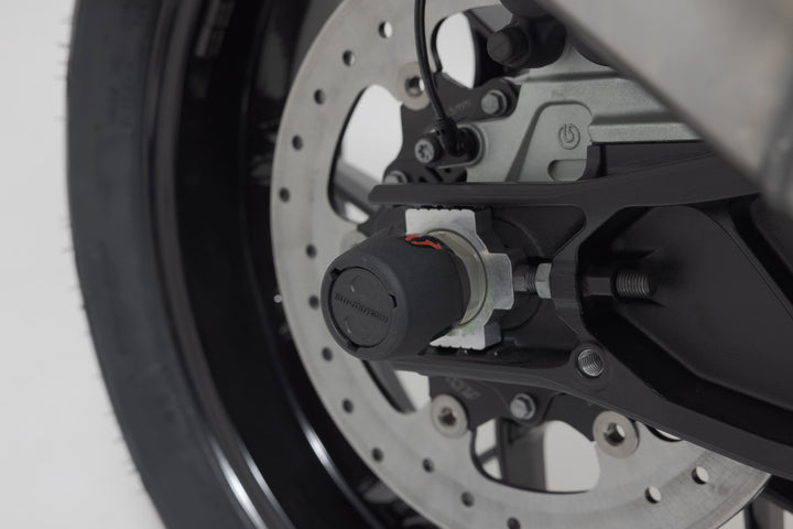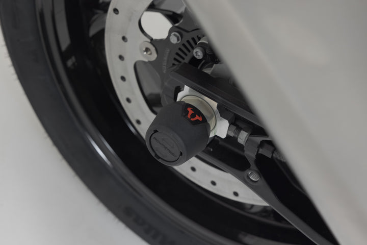 The rear axle crash pads made of abrasion-resistant plastic protect the swing arm from damage in the event of a fall. With a fiberglass content of 30%, the crash pad core is impact-resistant. The smooth surface also provides excellent sliding properties. The polished bull logo in red adds a visual highlight to your motorcycle.