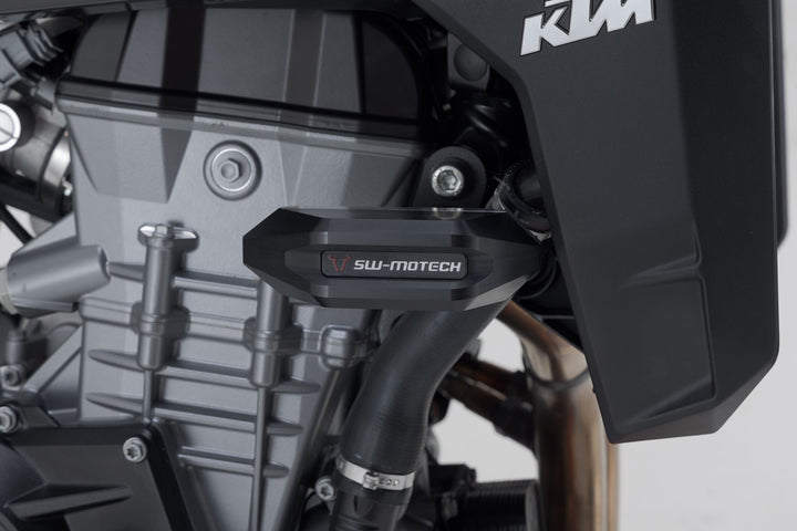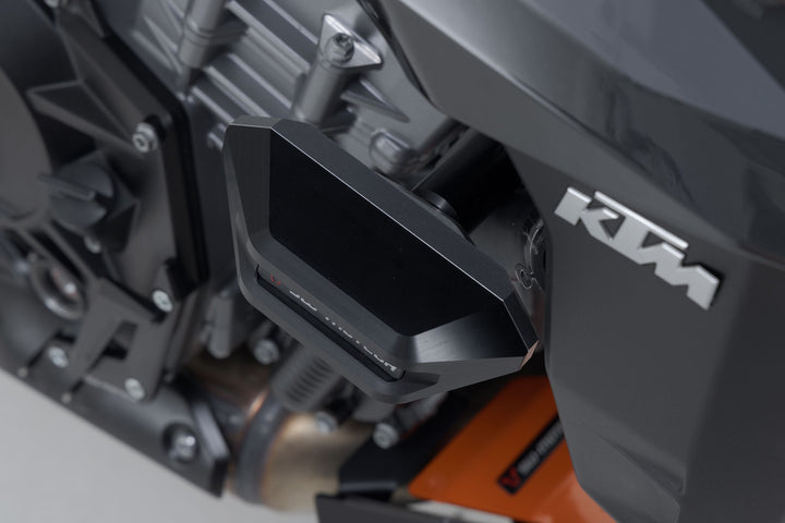 Frame crash pads provide additional protection in the event of a fall. The shape, surface and material of the pads provide excellent sliding properties to reduce damage to the motorcycle. The robust aluminium mounting bracket is easy to install, and the abrasion-resistant, CNC-milled slider pads are replaceable.