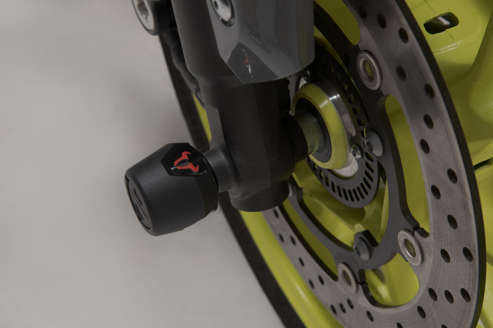 The front axle crash pads made of abrasion-resistant plastic protect the drive shaft from damage in the event of a fall. The smooth surface also provides excellent sliding properties. The polished bull logo in red adds a visual highlight to your motorcycle.