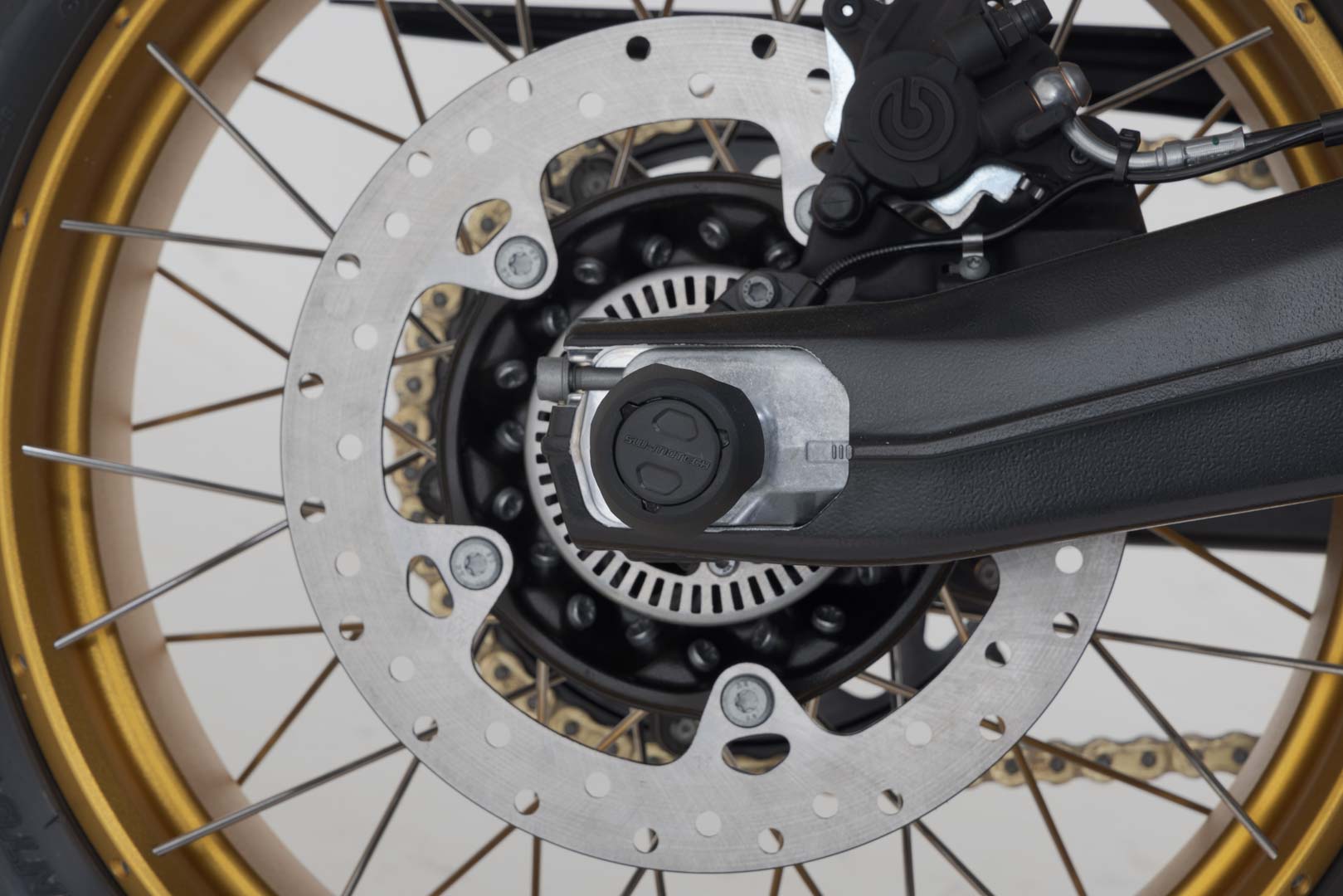 The rear axle crash pads made of abrasion-resistant plastic protect the swing arm from damage in the event of a fall. With a fiberglass content of 30%, the crash pad core is impact-resistant. The smooth surface also provides excellent sliding properties. The polished bull logo in red adds a visual highlight to your motorcycle.