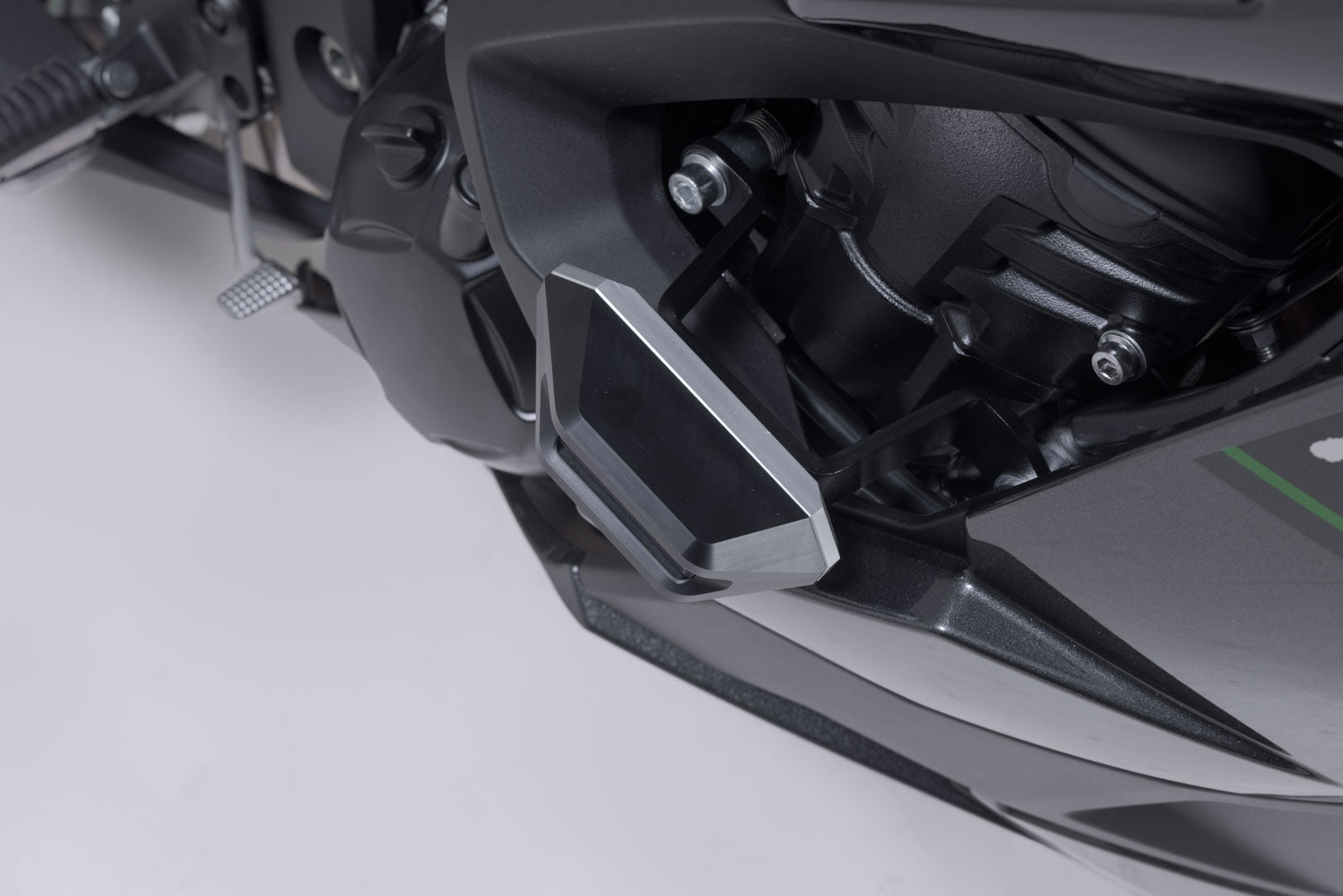 Frame crash pads provide additional protection in the event of a fall. The shape, surface and material of the pads provide excellent sliding properties to reduce damage to the motorcycle. The robust aluminium mounting bracket is easy to install, and the abrasion-resistant, CNC-milled slider pads are replaceable.
