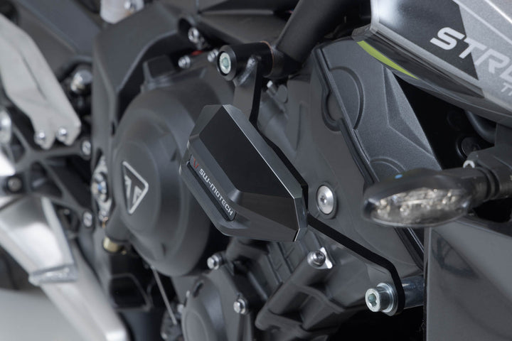 Frame crash pads provide additional protection in the event of a fall. The shape, surface and material of the pads provide excellent sliding properties to reduce damage to the motorcycle. The robust aluminium mounting bracket is easy to install, and the abrasion-resistant, CNC-milled slider pads are replaceable.