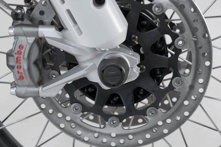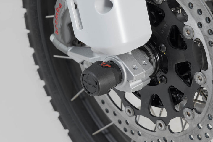 The front axle crash pads made of abrasion-resistant plastic protect the drive shaft from damage in the event of a fall. The smooth surface also provides excellent sliding properties. The polished bull logo in red adds a visual highlight to your motorcycle.