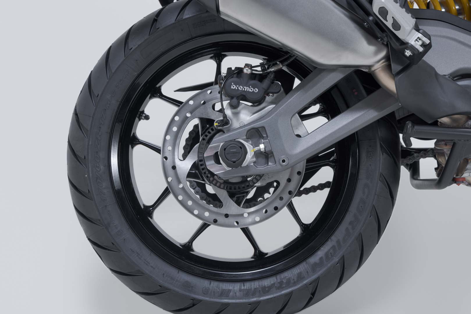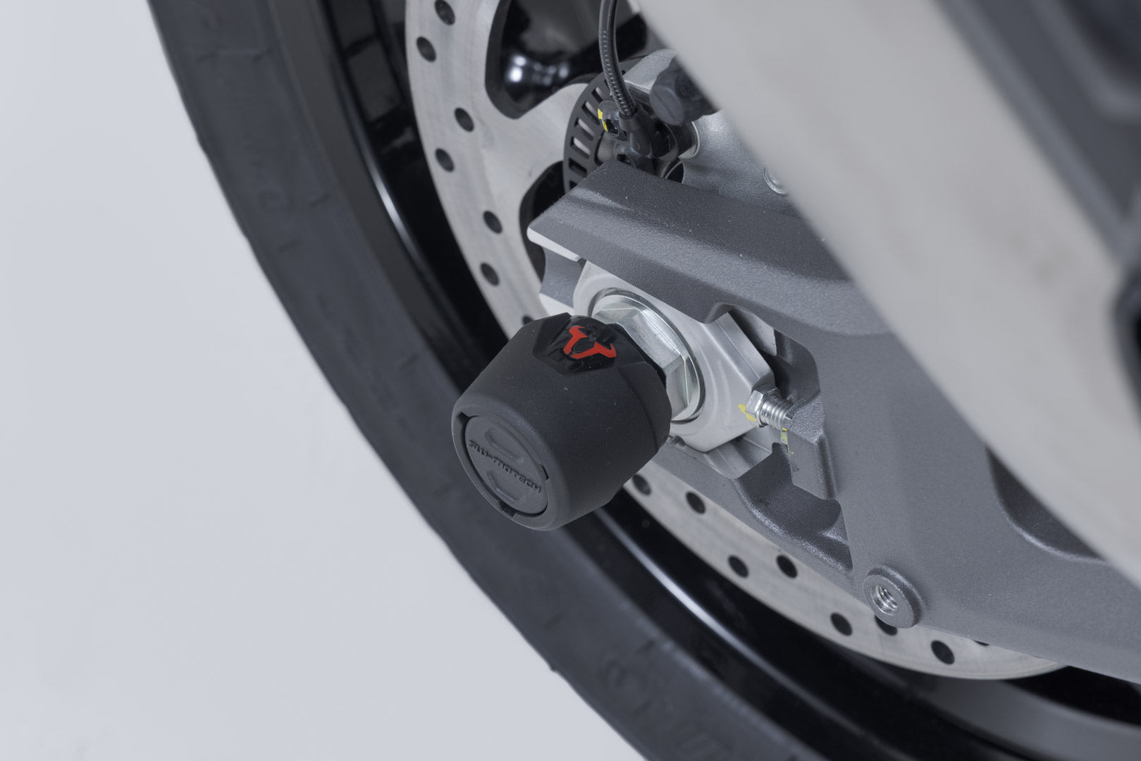The rear axle crash pads made of abrasion-resistant plastic protect the swing arm from damage in the event of a fall. With a fiberglass content of 30%, the crash pad core is impact-resistant. The smooth surface also provides excellent sliding properties. The polished bull logo in red adds a visual highlight to your motorcycle.